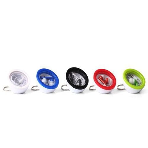 אוזניות בתוך מארז עגול ומחזיק מפתחות