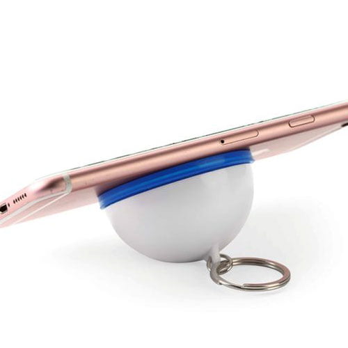 אוזניות בתוך מארז עגול ומחזיק מפתחות. המארז יכול לשמש כמעמד לנייד.