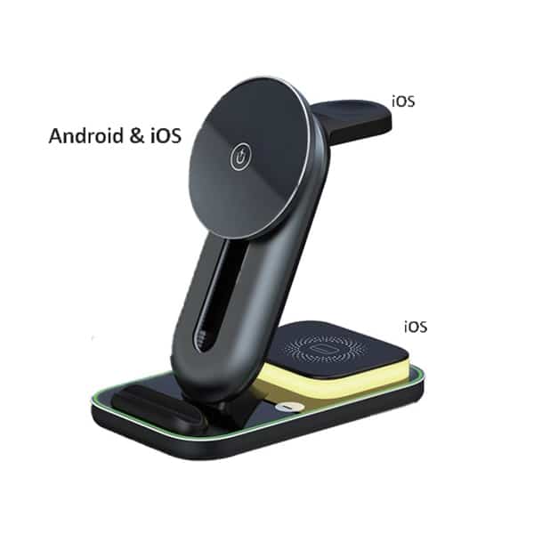 מטען אלחוטי מהיר 15W משולב עם תאורה 3 ב-1 לנייד + שעון חכם + אוזניות