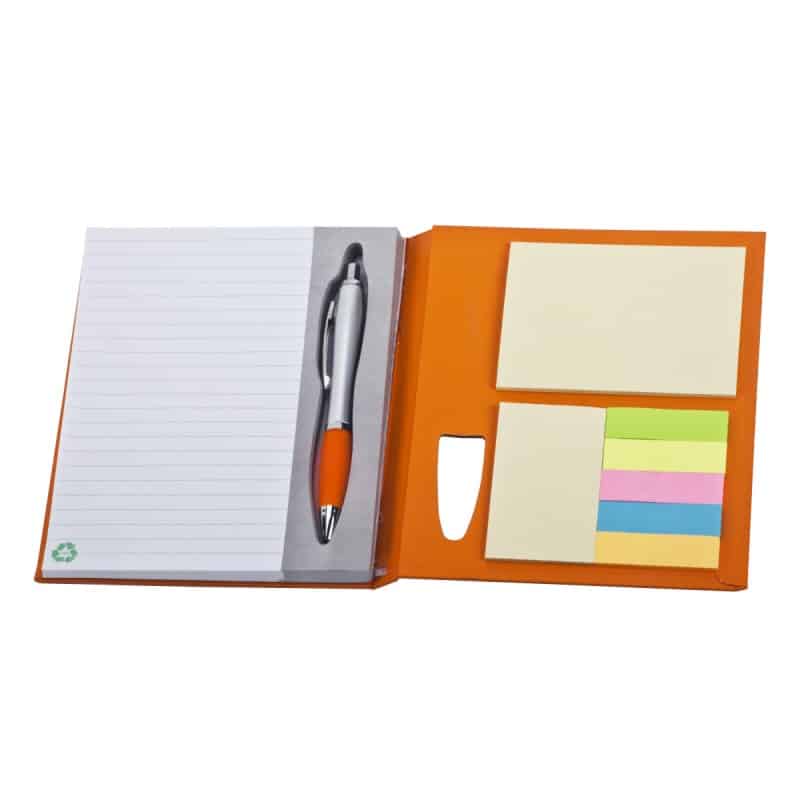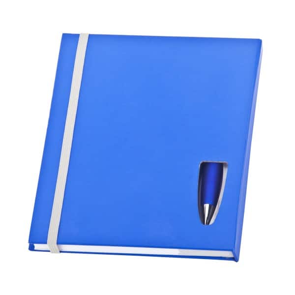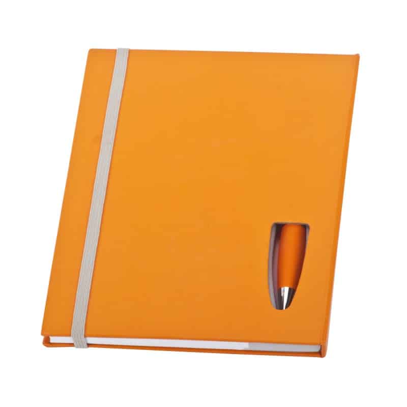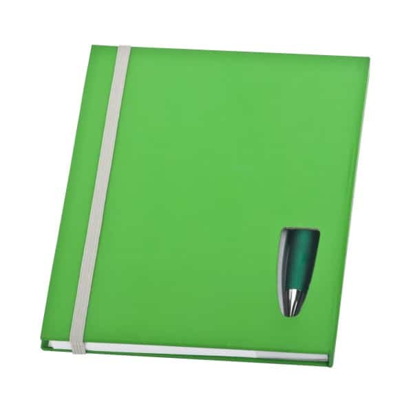 מחברת A5 דפי שורה, דיגלונים ועט כדורי בצבע תואם. גומייה לסגירה