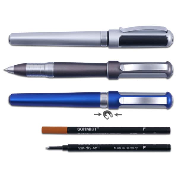 עט רולר מעוצב עם אביזרי מתכת וסגירה מגנטית, שטח פרסום ייחודי ומילוי גרמני של SCHMIDT