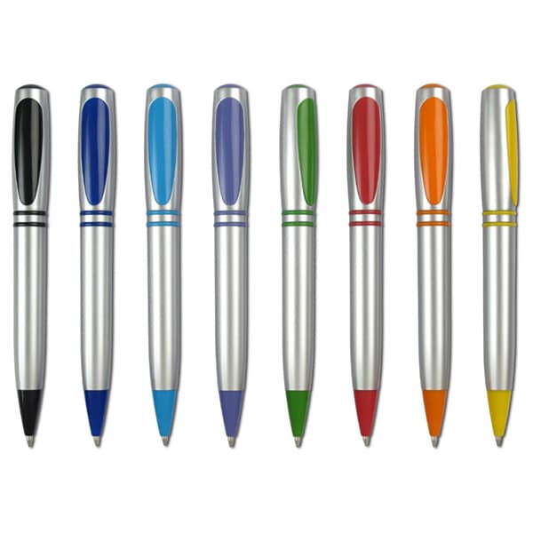 עט כדורי פלסטי עם פתיחת פטנט בסיבוב, הקליפ קופץ שהעט סגור לאפשרות תלייה
