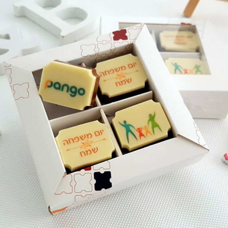 מארז פרלינים איכותיים בעבודת יד, ניתן להדפיס על השוקולדים שלנו כל תמונה, סמל, לוגו או כיתוב אחר לבחירתכם