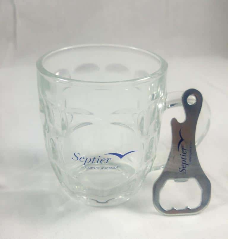 סט של כוס בירה עם הדפסת לוגו בשילוב פותחן בקבוקים מגנטי עם הדפסת לוגו