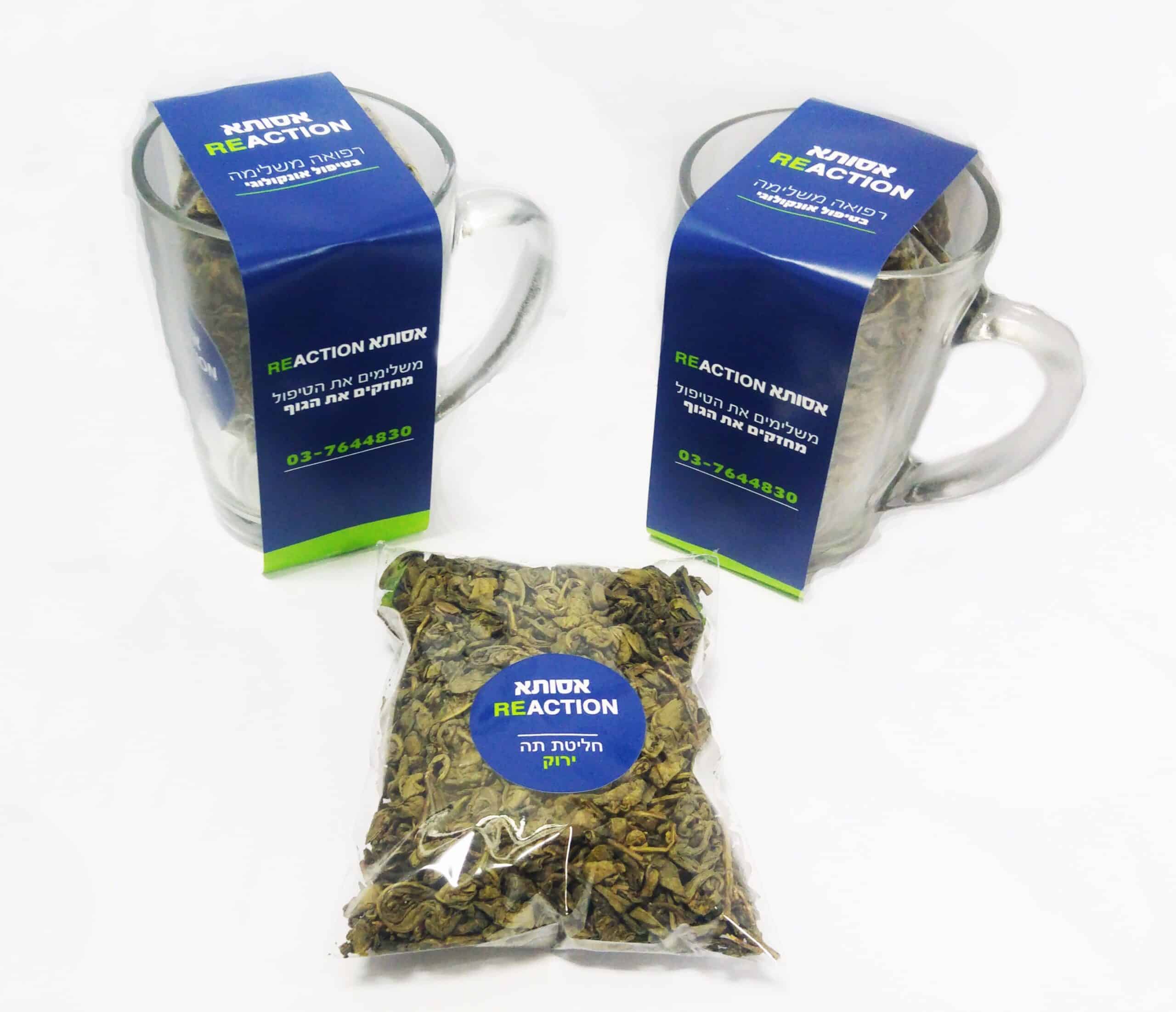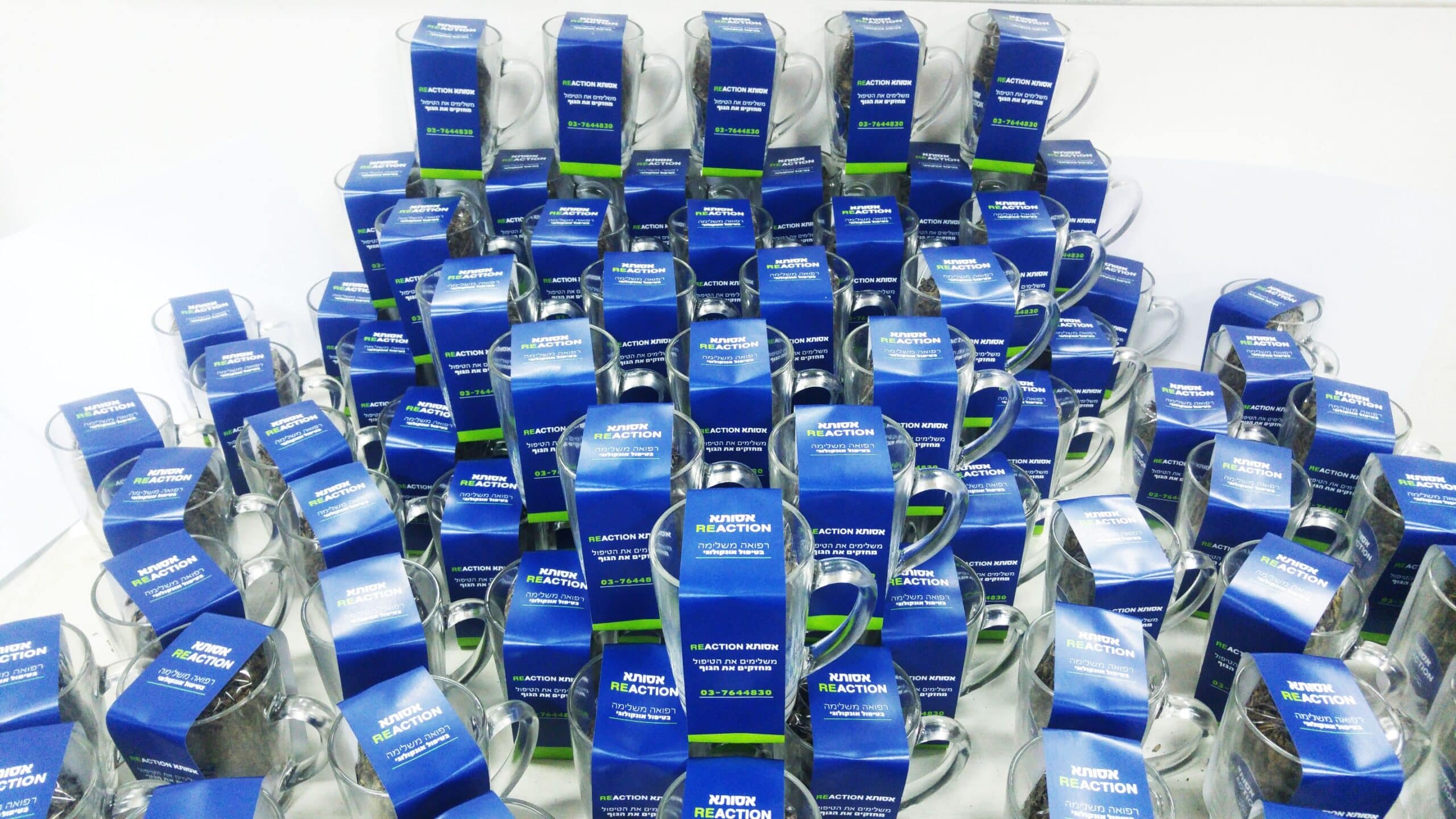 בתוך הספל שקית חליטה לבחירה מתוך מגוון חליטות איכותיות, ממותגת באמצעות מדבקת ויניל צבעונית, הספל והחליטה עטופים בחבק נייר ממותג וצבעוני.