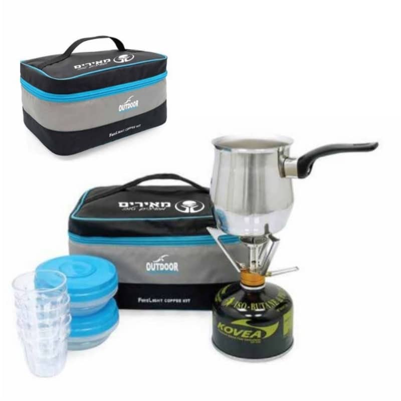 ערכת קפה,במארז תיק בד עם ידית נשיאה כוללת גזייה קומפקטית וקלה. ערכת הקפה כוללת פינג'ן אלומיניום, 4 כוסות פוליקרבונט, שלוש קופסאות אחסון