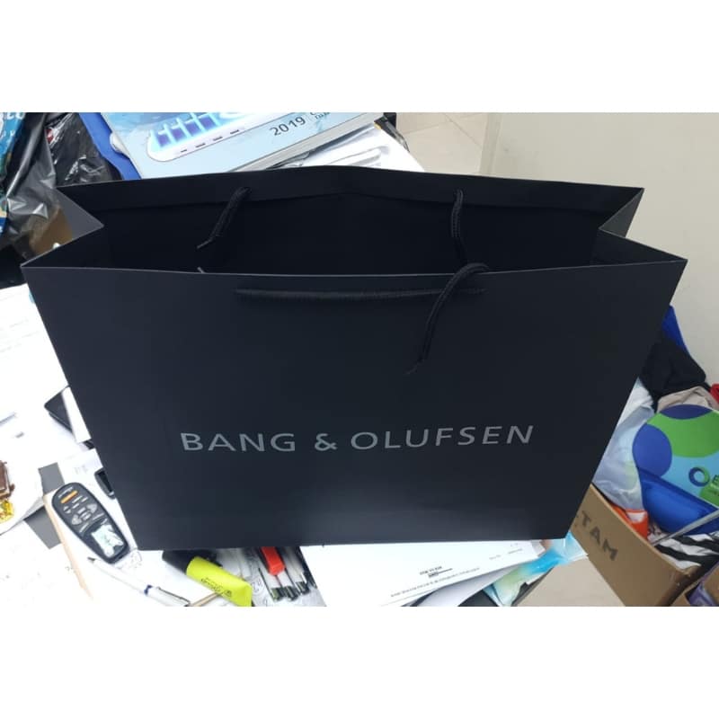 שקית קרטון שחורה עם ידיות שרוכים כולל הדפסת לוגו משני הצדדים