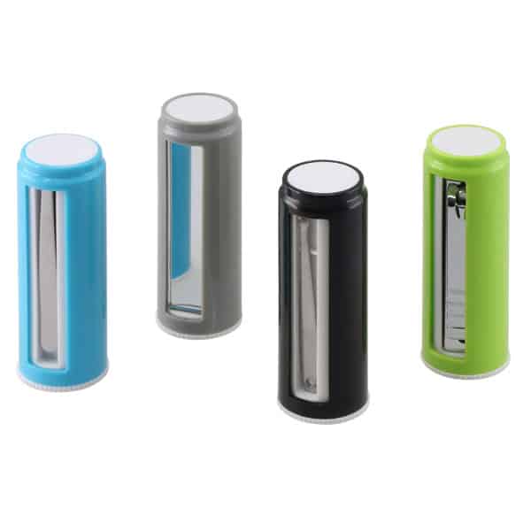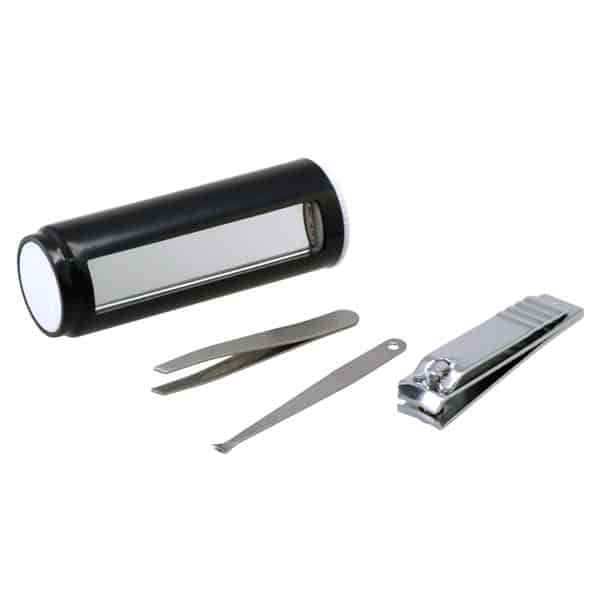 סט מניקור קומפקטי בקופסת גליל עם מראה , קוצץ ציפורניים מנקה אוזניים ופינצטה,במארז פטנט