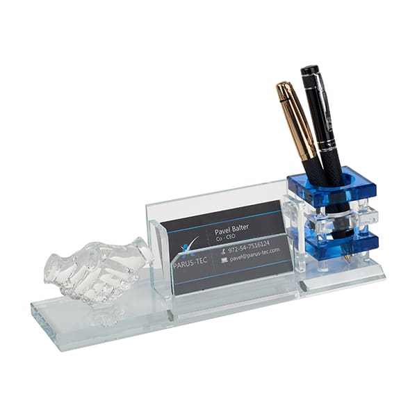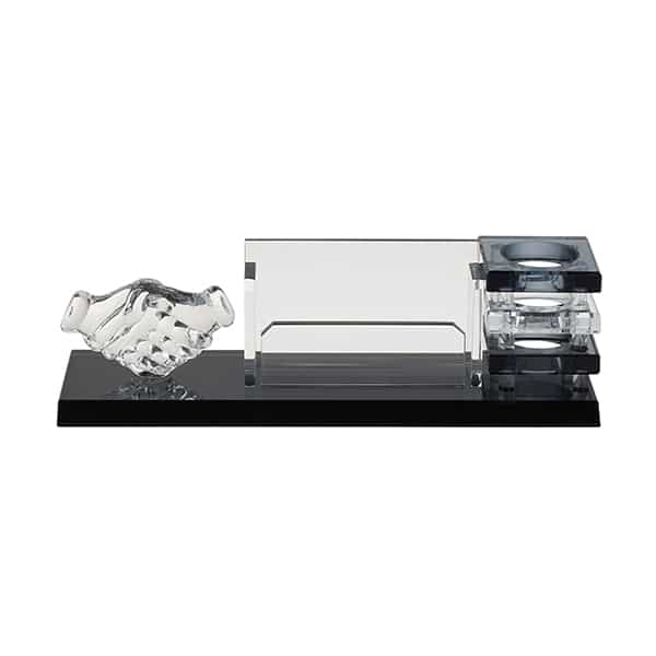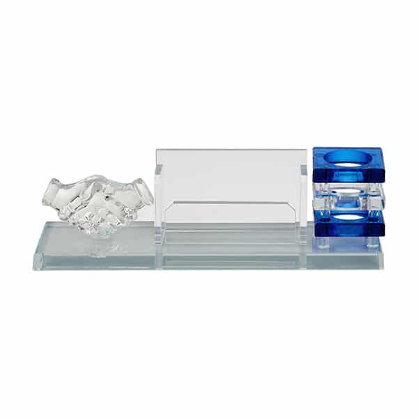 מעמד קריסטל לחיצת יד עם מעמד לכרטיסי ביקור וכוס לעטים כחול/שחור