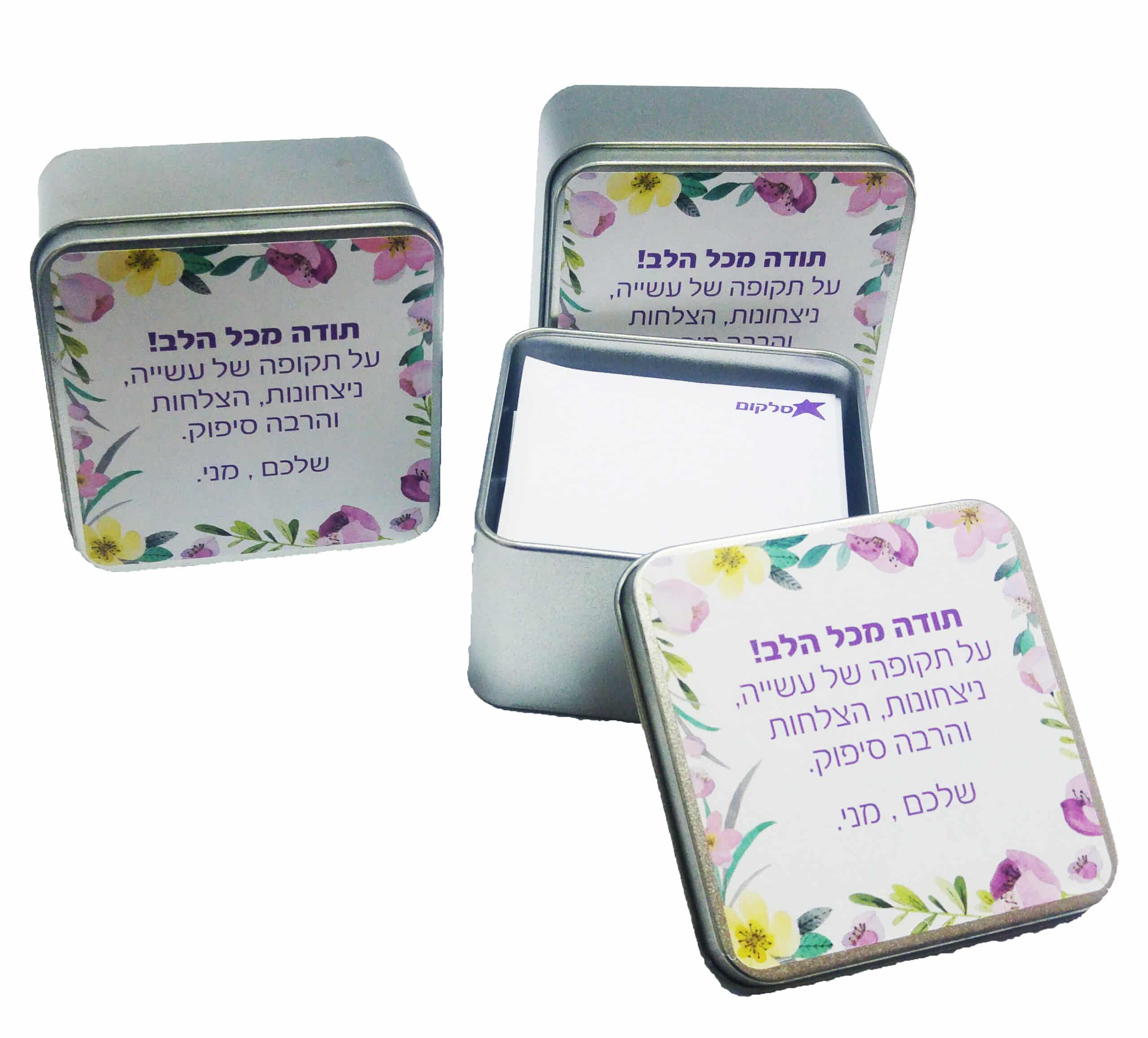 מארז מתכתי לדפי ממו עם מיתוג צבעוני על גבי הקופסא ושם משתנה לכל עובד על גבי הדפים.