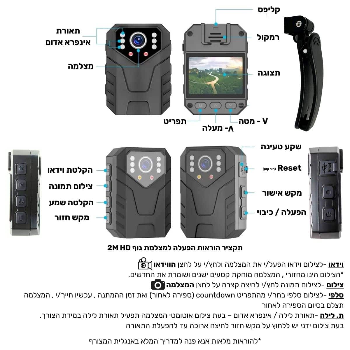 מצלמת גוף 1920/1080HD מסך 2.0" עם כרטיס זכרון 32GB כלול, תאורת לילה, וידאו+סטילס ותופסן למדים