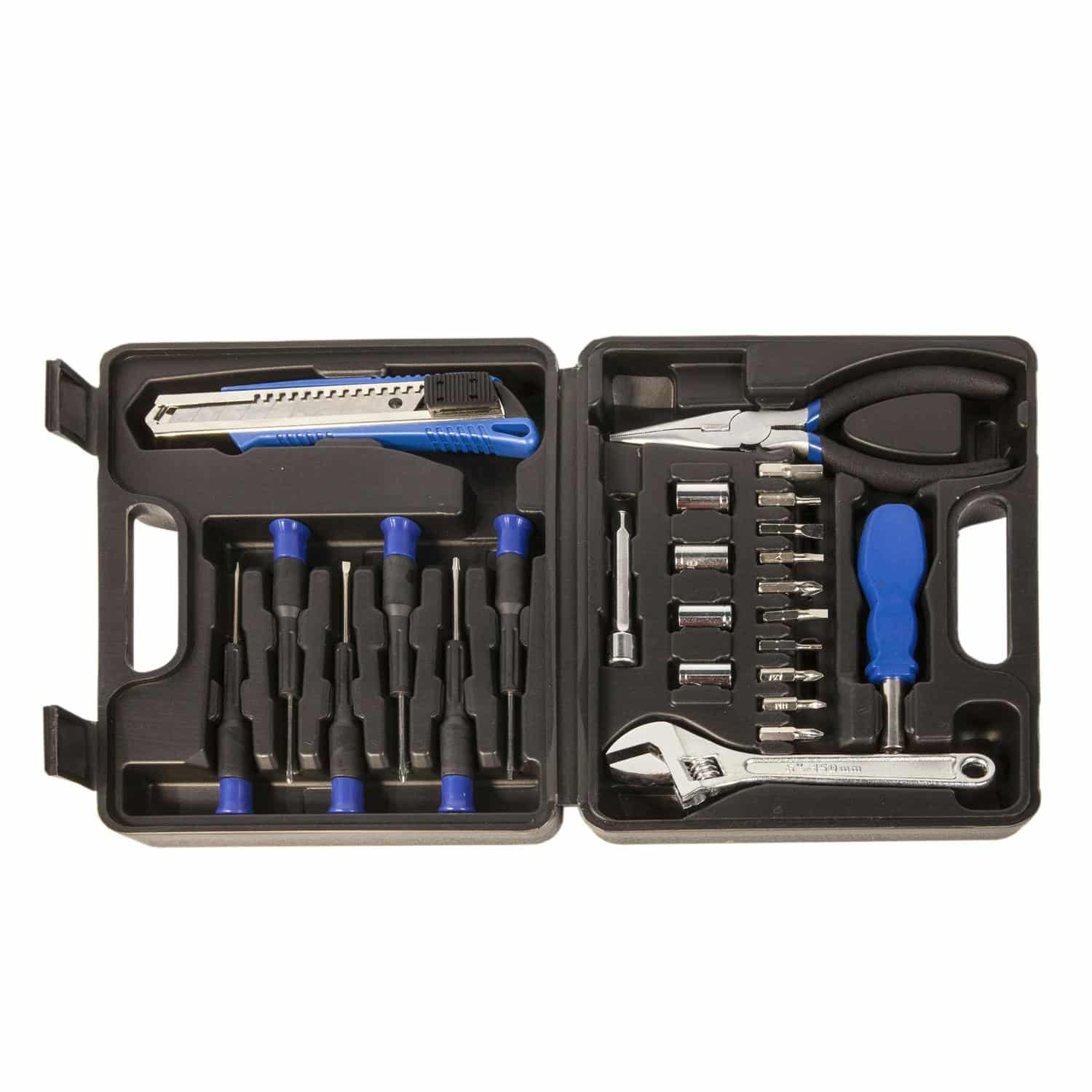 קופסת כלים בינונית המכילה סכין יפנית מקצועית, 6 מברגים עם ראשים שונים, ביטים, פלאייר, מפתח שוודי, בוקסות.