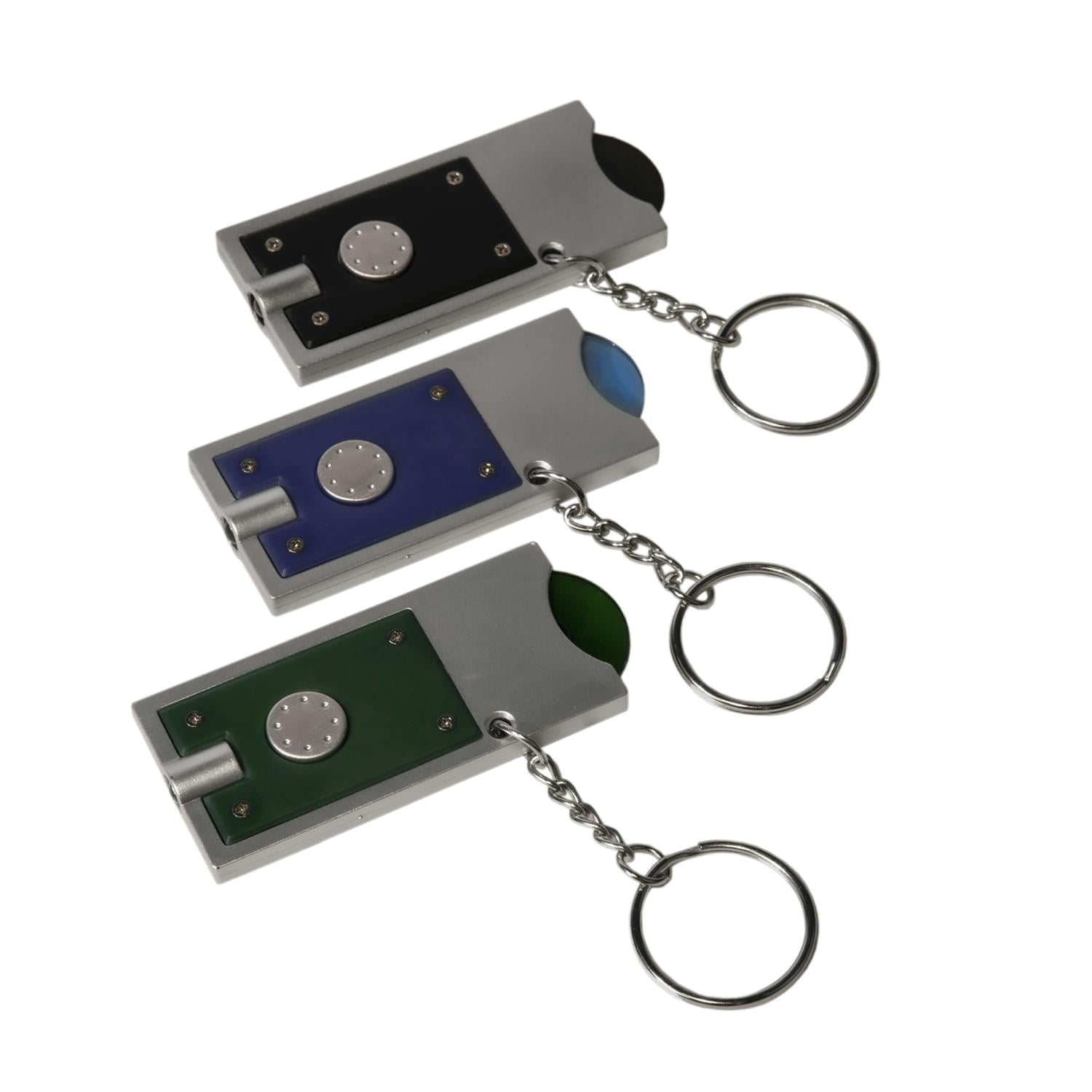 מחזיק מפתחות עם פנס לד ומטבע תואם לפתיחת לעגלת סופר.