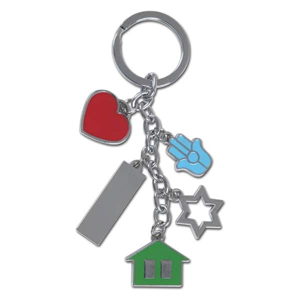 מחזיק מפתחות עם תליונים של בית,לב,חמסה ,מגן דוד ולוחית מתכת באריזת מתנה שחורה