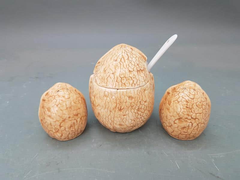 סט להגשת חרוסת פלוס מלחייה ופלפלייה בעיצוב אגוז