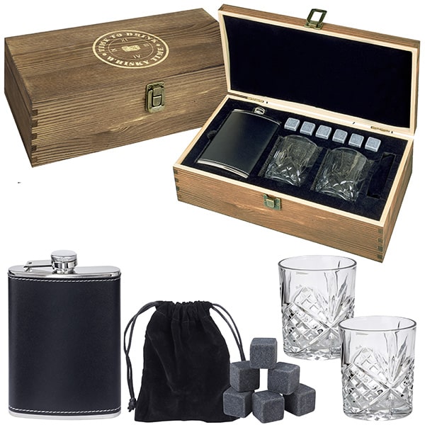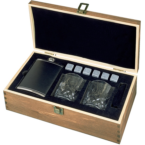 מארז מתנה וויסקי הכולל פלאסק + 2 כוסות ואבני קרח בקופסת עץ מהודרת