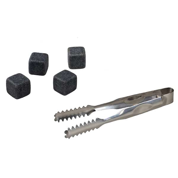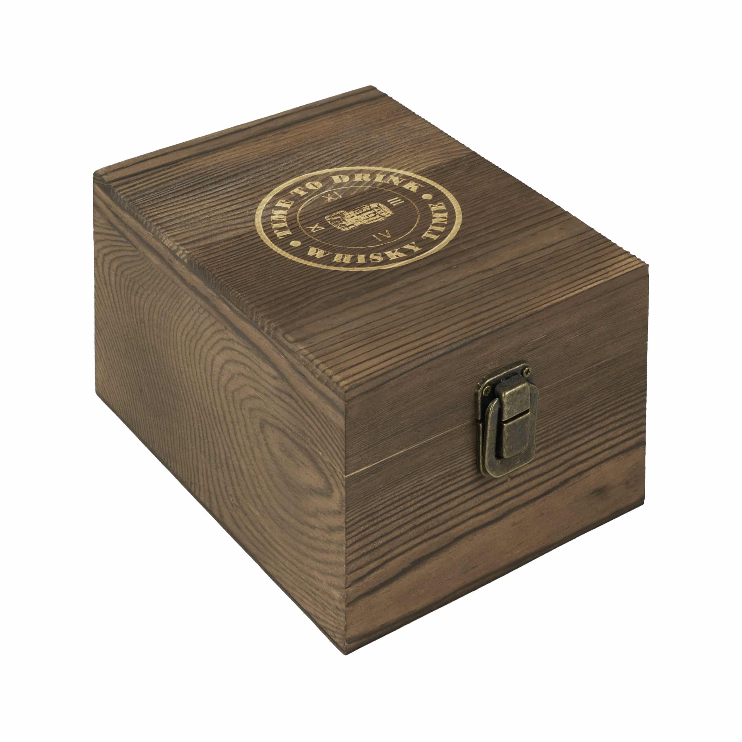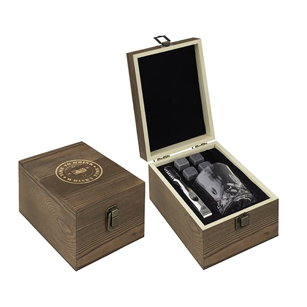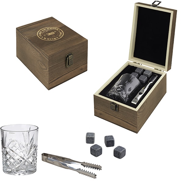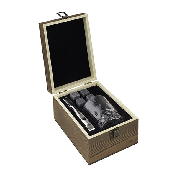 מארז מתנה וויסקי הכולל כוס, מלקחיים, ו-4 אבנים בקופסת עץ מהודרת