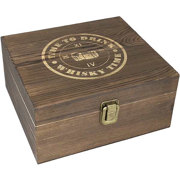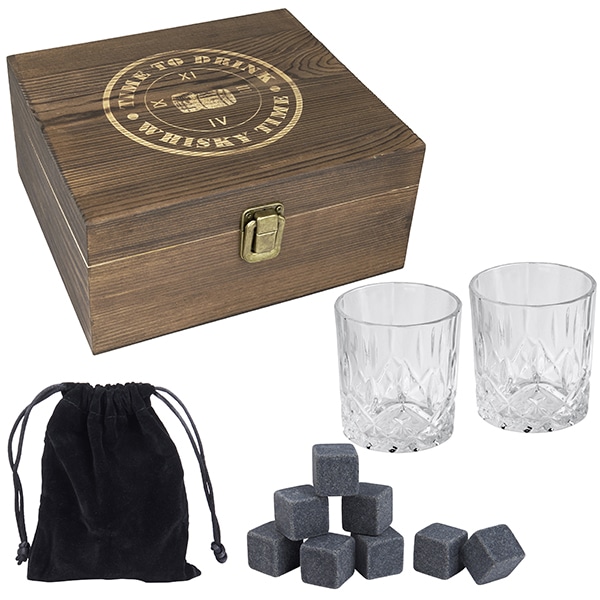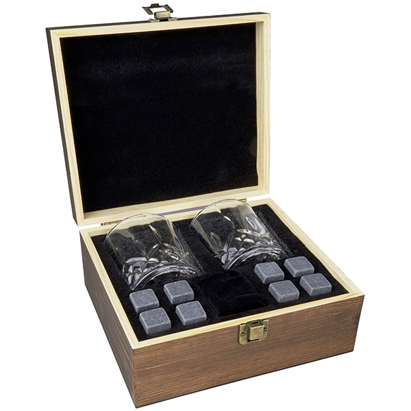מארז מתנה וויסקי הכולל 2 כוסות ו-8 אבני קרח בקופסת עץ מהודרת