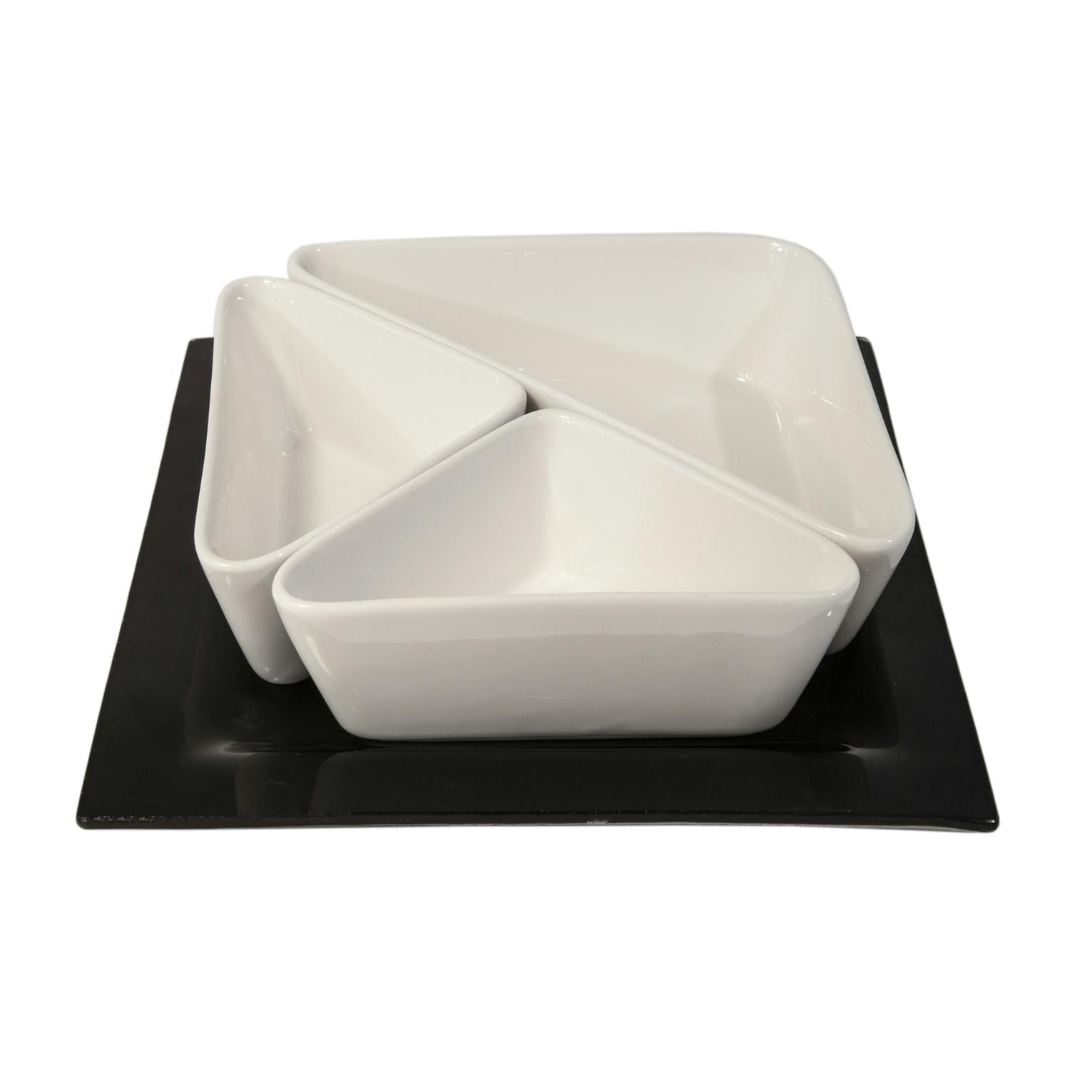 סט 3 צלוחיות משולשות מקרמיקה פורצלן במגש זכוכית מלבני.