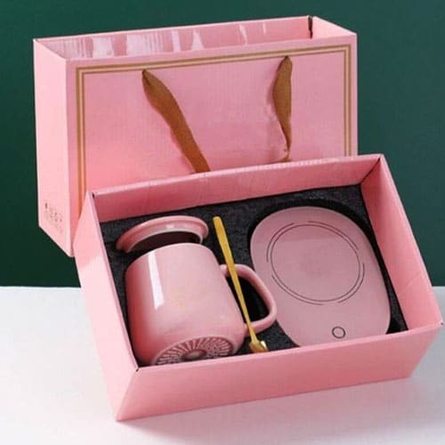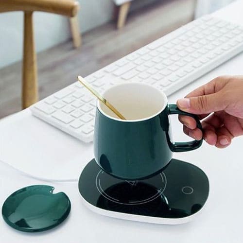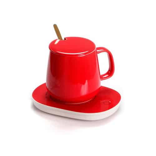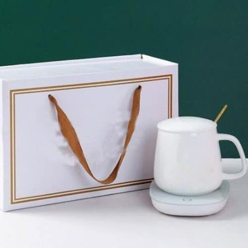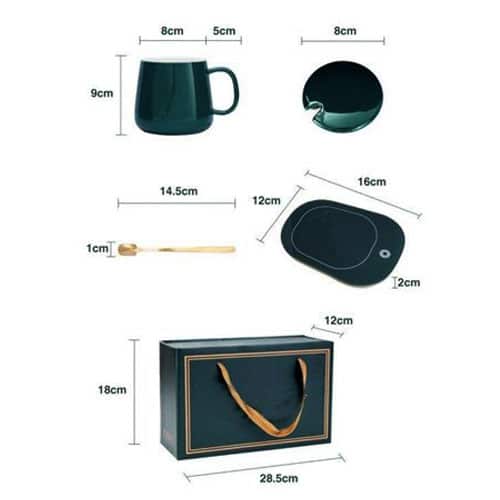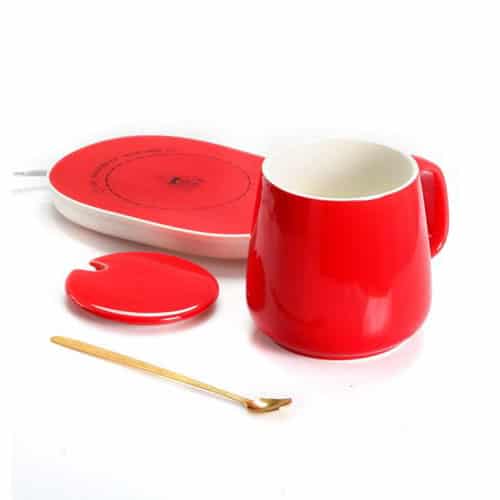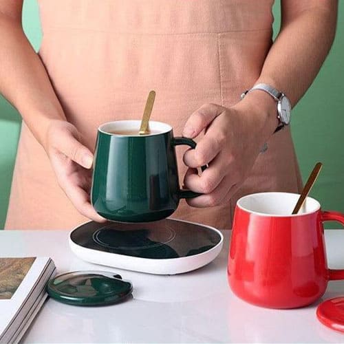 פלטת חימום חשמלית משולבת בספל קרמיקה עם כיסוי וכפית מוזהבת