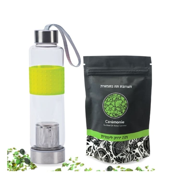 מארז כיפי ומפנק הכולל בקבוק חליטה מקצועי עשוי זכוכית וחבק סיליקון לאחיזה נוחה, הבקבוק מכיל מסננת לחליטה לקבלת משקה טבעי וללא חתיכות.