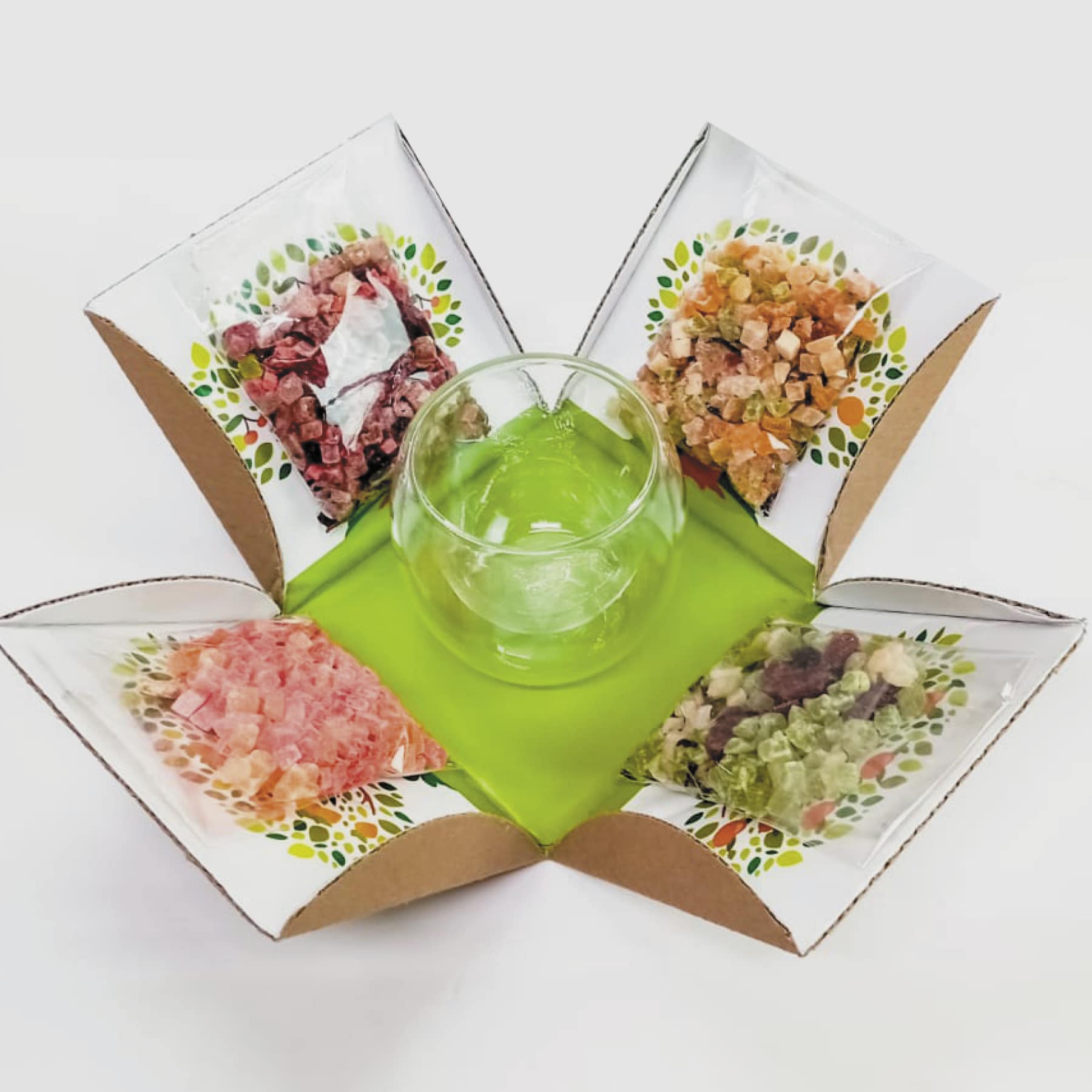 4 חליטות פרי כל שקיק כ-40 גרם, ספל דופן כפולה 270 מ"ל
