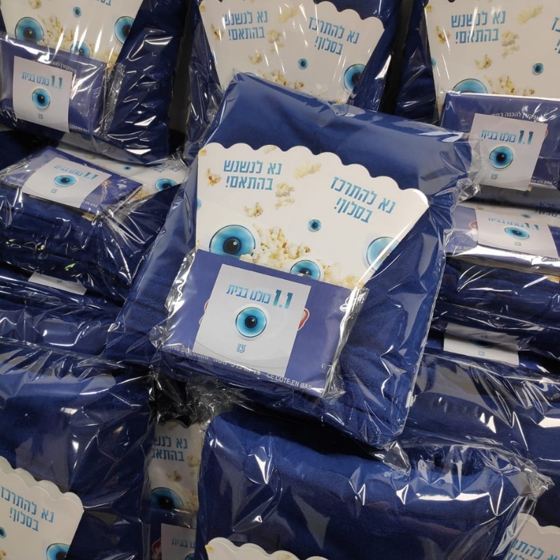 כרבולית איכותית ונעימה עם רקמת לוגו ומארז פופקורן ממותג בשילוב שקית להכנת פופקורן במיקרוגל