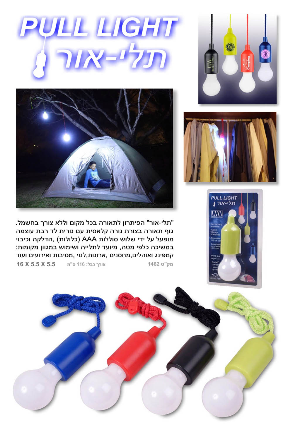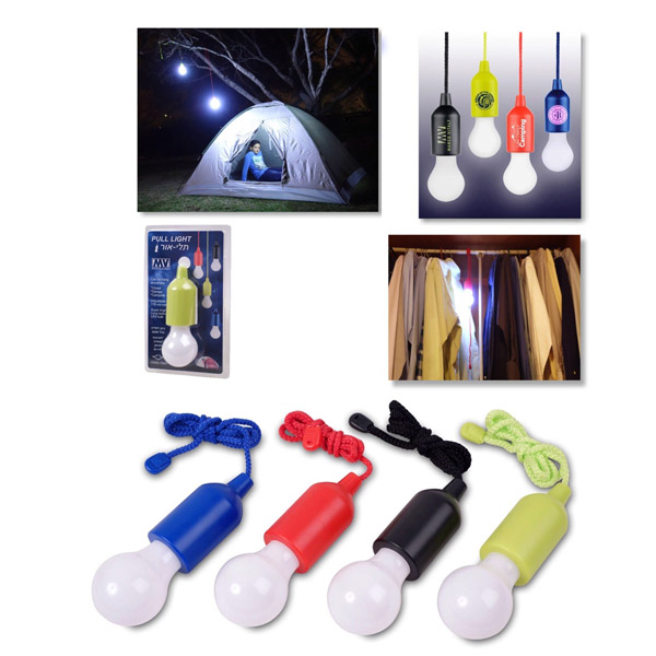 הפתרון לתאורה בכל מקום וללא צורך בחשמל. גוף תאורה בצורת נורה קלאסית עם נורית לד עוצמתית . הדלקה וכיבוי במשיכה כלפי מטה, מיועד לתלייה ושימוש במגוון מקומות כמו קמפינג ואוהלים, ארונות, מחסנים, מסיבות אירועים ועוד..