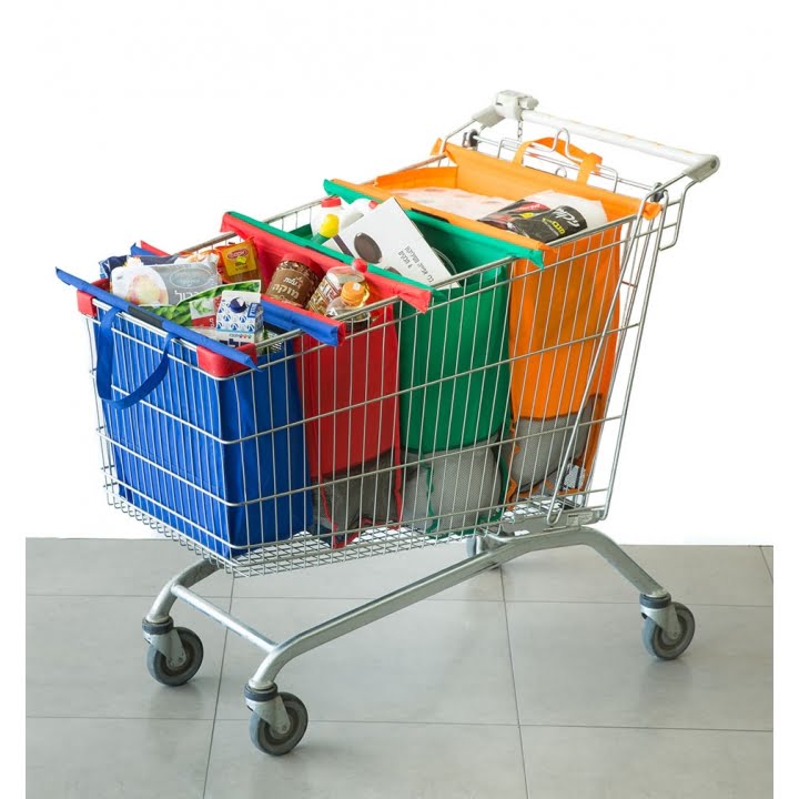 סט 3 תאים מבד ממוחזר איכותי + תא צידנית עם פטנט מובנה לעגלת קניות