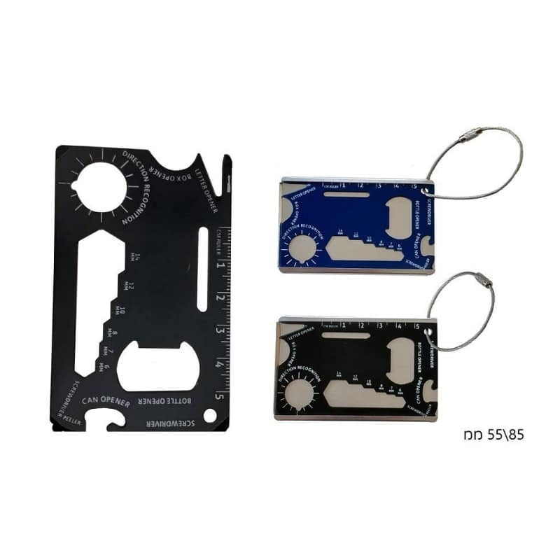 פרימיום – כרטיס הישרדות מתכתי מולטי פונקציות בעל תושבת ולולאה – כולל חריטת לייזר