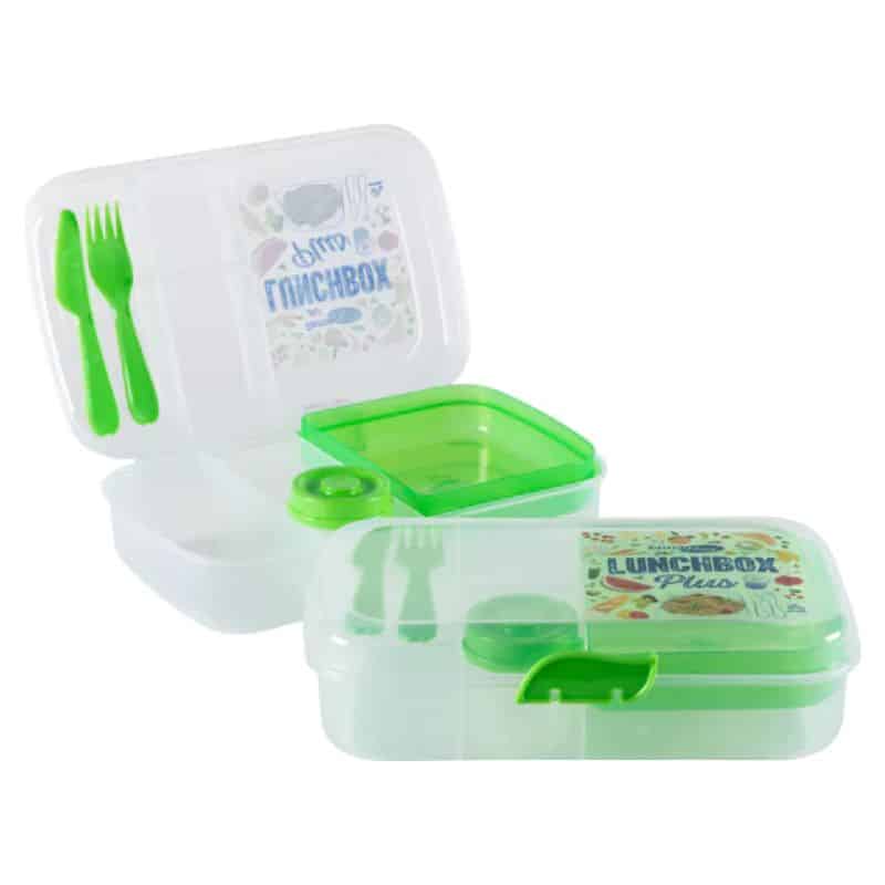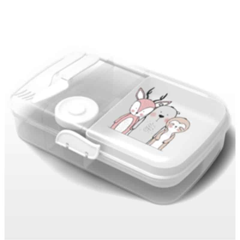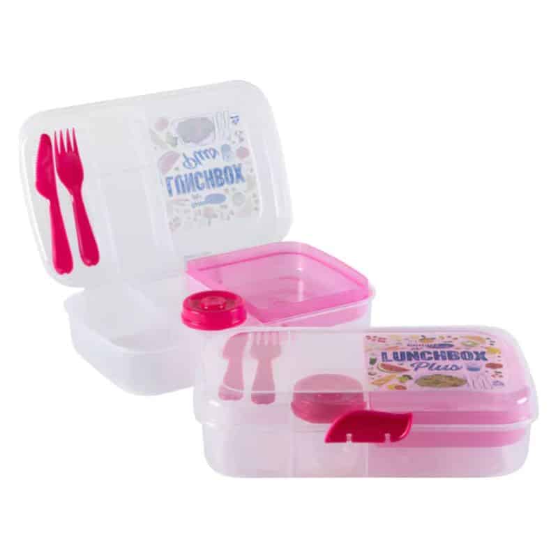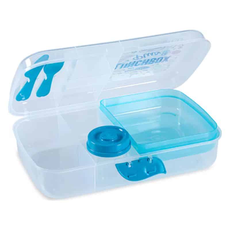 קופסת אוכל מעוצבת וצבעונית מידה 26x16x7 ס"מ בעלת חלוקה לתאים עם מכסה המחובר בציר אינטגרלי כולל סכו"ם ילדים, קערית חימום או הפרדה וצנצנת רוטב