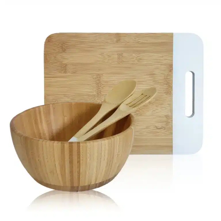 קערה לסלט, קרש חיתוך ושתי כפות ערבוב