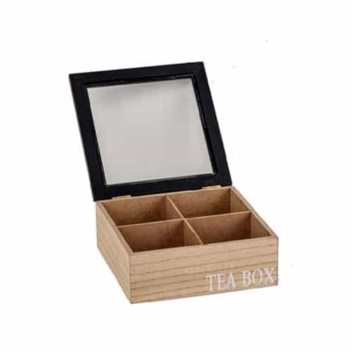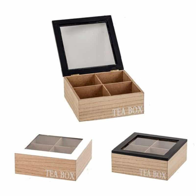 קופסת תה מעץ וזכוכית 4 תאים מכסה לבן
