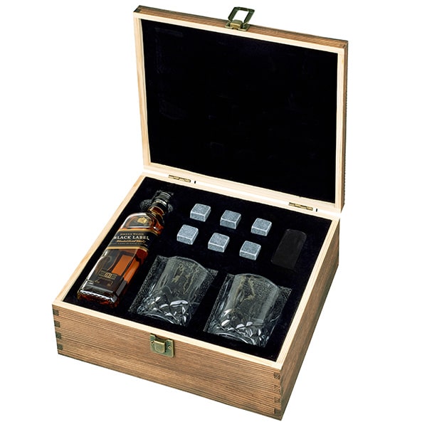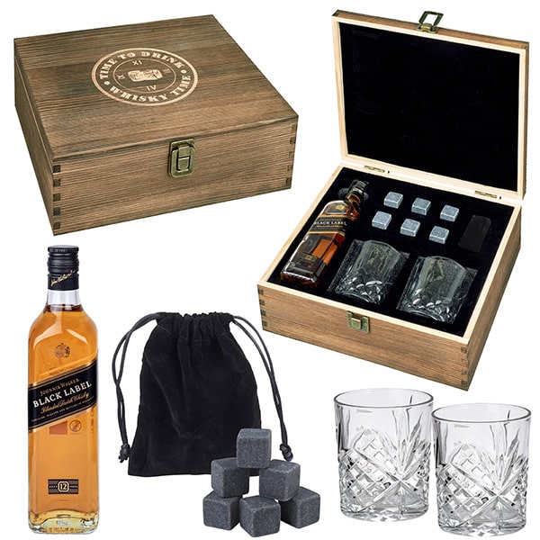 מארז מתנה וויסקי הכולל בקבוק ג'וני ווקר + 2 כוסות ואבני קרח בקופסת עץ מהודרת